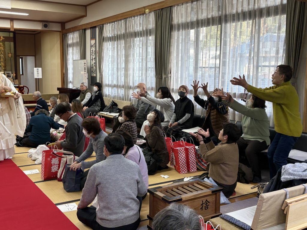 休憩を挟んでいよいよ皆さんお待ちかねの豆まきが始まります。今年は61名の申し込みがあり、4回に分けて宝前で厄除祈願を受けられた後外陣に移動し豆まきが行われました。「福は内」の合図で一斉に枡から福豆や飴玉、落花生、お菓子類が撒かれました。受け手の皆さんは両手をあげ黄色い声をあげて大喜び。最後の総蒔きでは奉仕者の方も参加してぬいぐるみの人形や、野菜、果物まで盛大に撒かれ、うまくキャッチした時には拍手が沸き起こり、大盛り上がりのうちにフィナーレを迎えました。